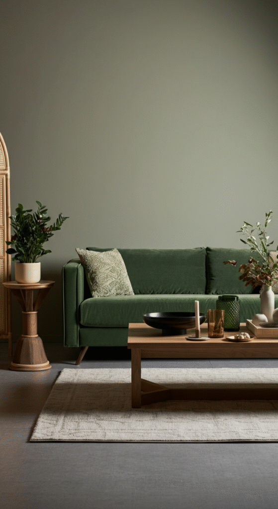 - Rustic and Farmhouse: Use muted, earthy greens like olive or sage and pair them with wooden furniture, soft textiles, and vintage accessories for a charming, rustic living room.