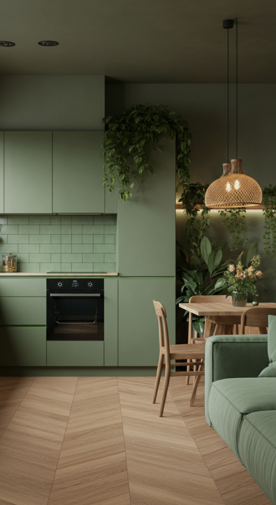 Open-plan living spaces often include a living room and kitchen area. Using green in both areas can create a seamless transition between spaces. Consider adding green elements to the kitchen, such as green tiles or plants, and extend the color to the living room with green furniture or wall accents.