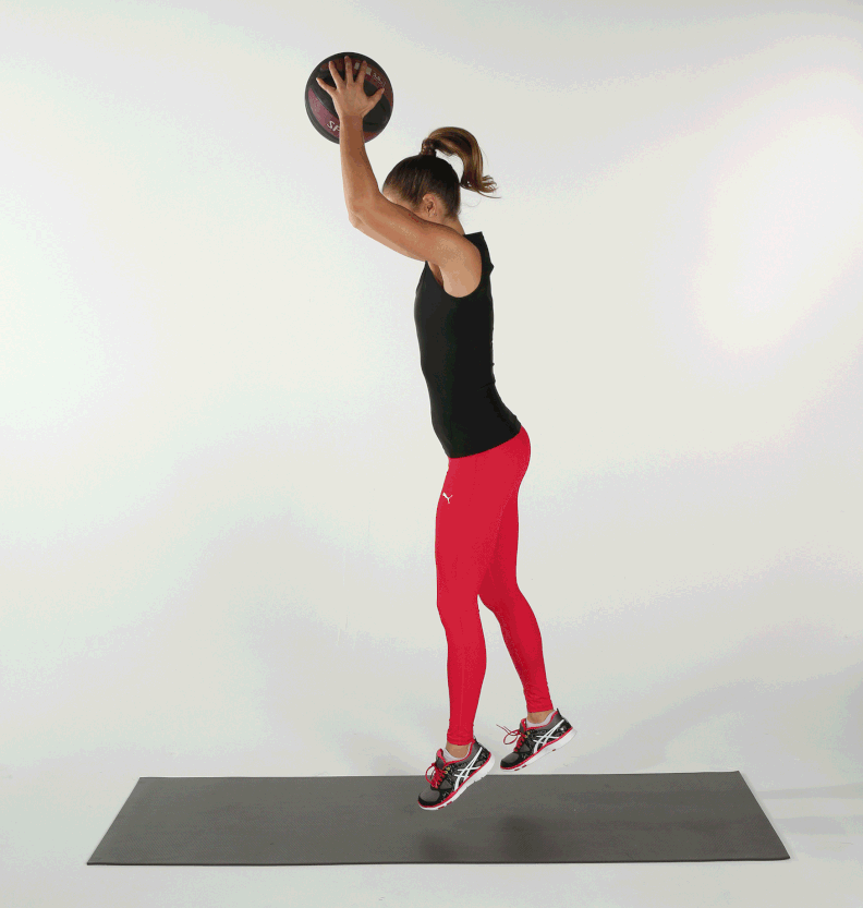 • Stand with feet shoulder-width apart, holding a medicine ball overhead.