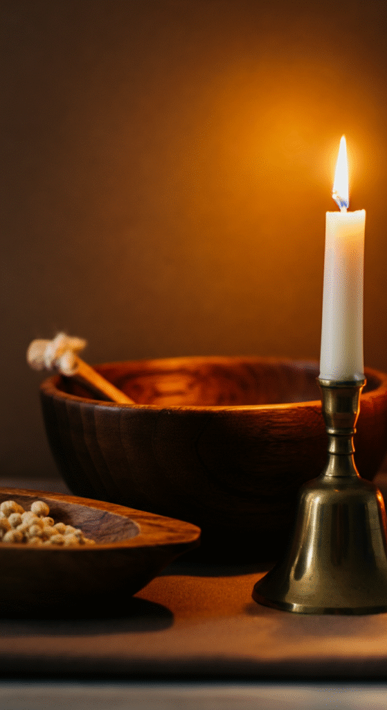 A small wooden bowl, a brass bell, and a candle together form a timeless and cozy vignette. This style fits living rooms, bedrooms, and entry tables.