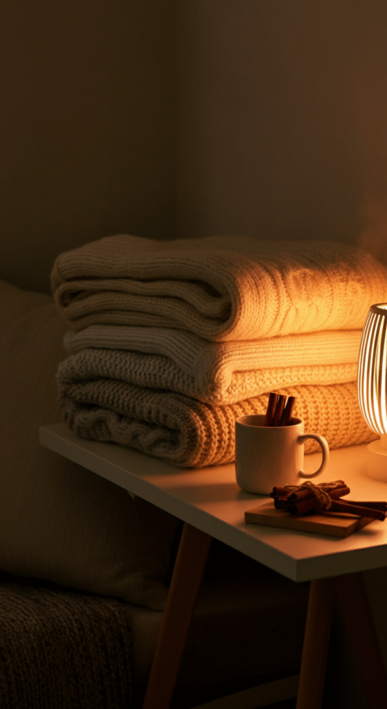 Textures play a huge role in hygge styling. A simple vignette made from folded knit blankets, a soft cushion, and a lantern beside them instantly sets a comforting mood.