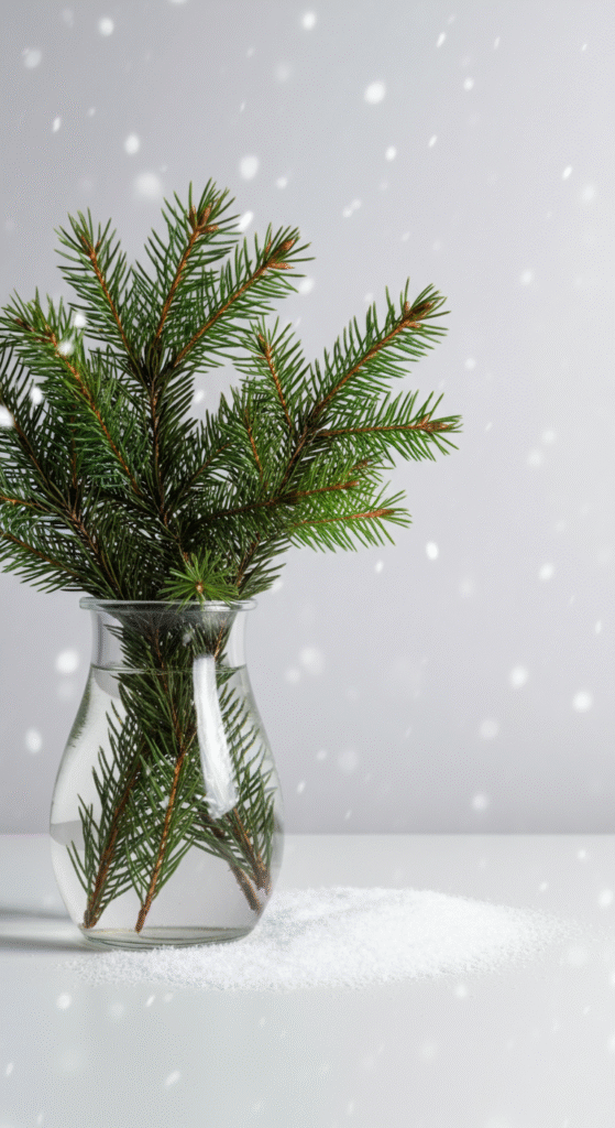 A single clear vase. Fresh evergreen branches. A little snowfall effect created with a dusting of faux snow or coarse salt around the base.