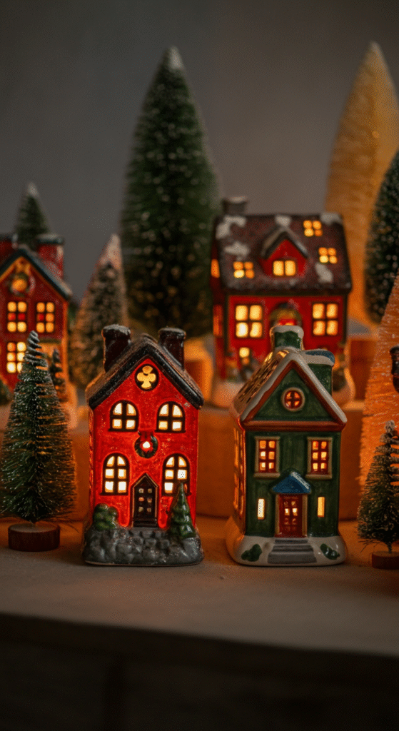 Space them slightly apart and add a few bottle brush trees for height. This small vignette looks charming on mantels and shelves, especially in the evening when the lights mimic a quiet northern town.