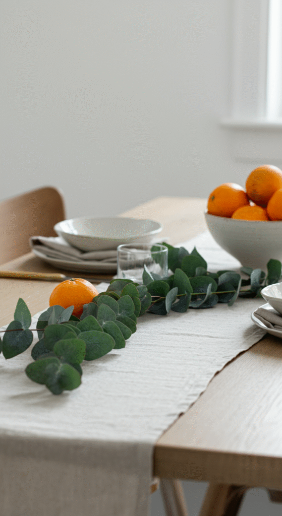A linen runner instantly softens the atmosphere of a dining table or console. Build your vignette using neutral ceramics, a bowl of fresh oranges, and a thin garland of eucalyptus running across the fabric.