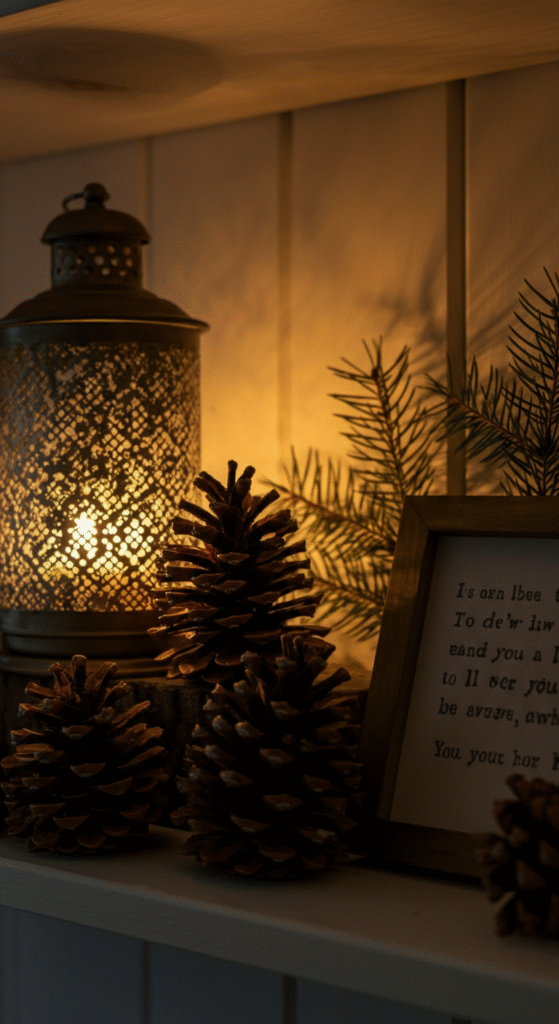 6. Pinecone and Lantern Shelf Display