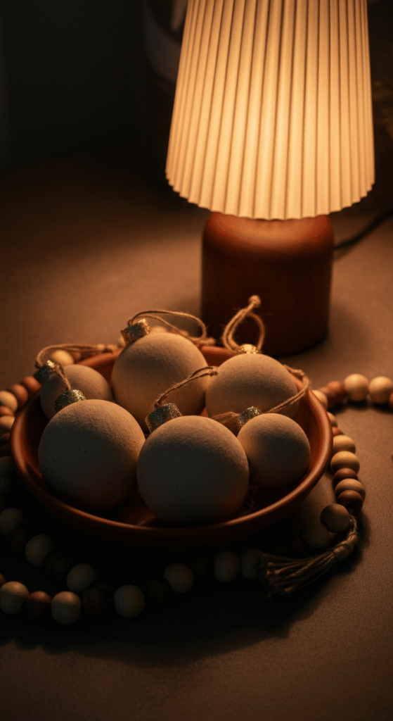 Place the bowl beside a lamp so the warm light enhances the matte textures. Add one wooden bead garland for movement.