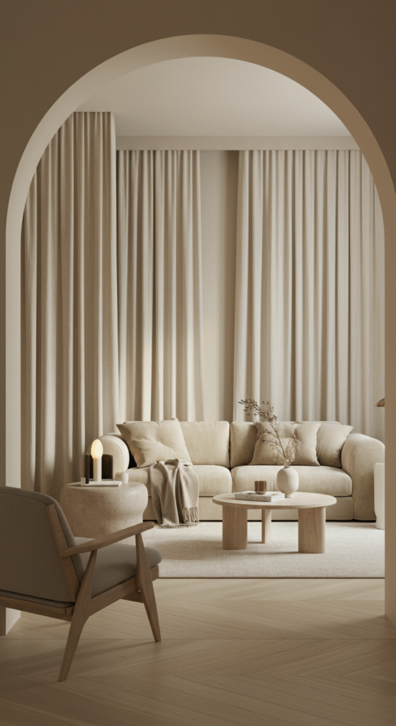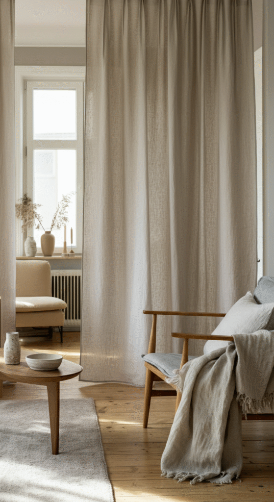 Fabric curtains are an affordable and easy solution for partitioning your living room. Soft, flowing curtains in neutral colors like grey, white, or beige add texture while allowing for a flexible room division. You can draw them closed to create a private nook or leave them open to maintain an uninterrupted flow between spaces.