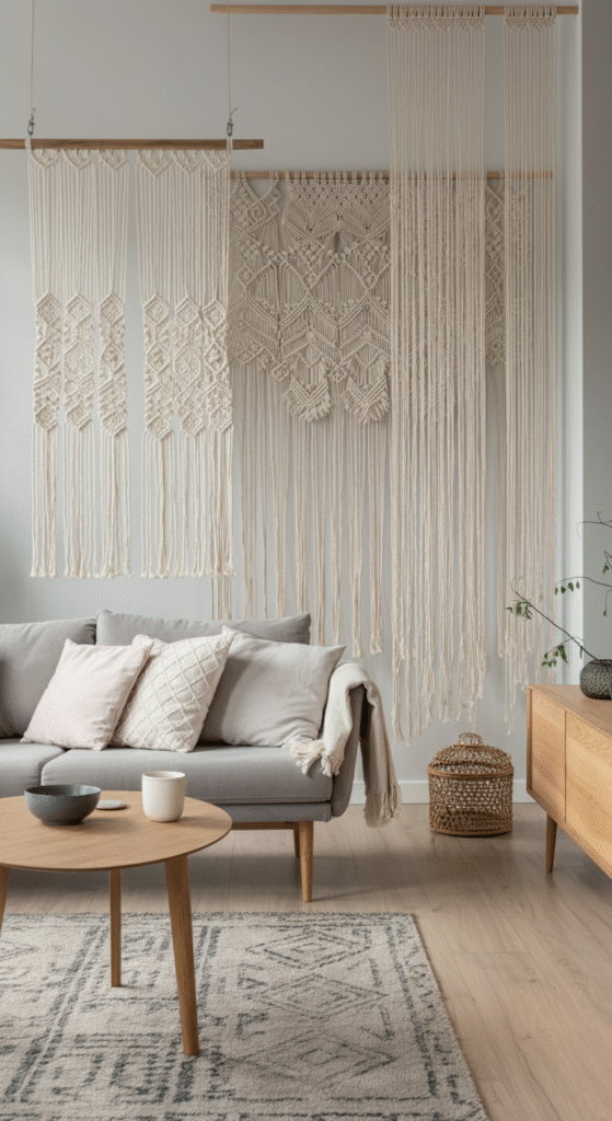 Hanging room dividers, like macramé wall hangings or suspended fabric screens, are an elegant way to create visual separation without taking up floor space.