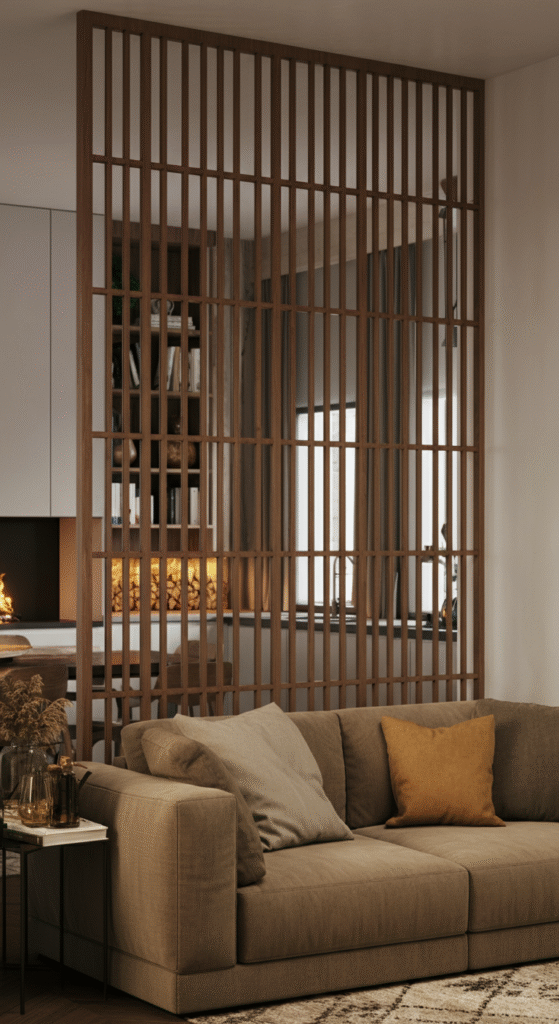 These partitions work wonders for dividing large, open-plan living rooms without overwhelming the room’s visual flow. The slats can be arranged vertically or horizontally, depending on the desired effect.