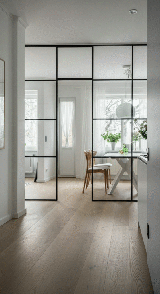 Glass partitions allow light to flow freely between spaces, preserving the open and airy feel that is central to Scandinavian design. They also provide clear separation between different areas, such as a living room and a home office, without feeling too enclosed.
