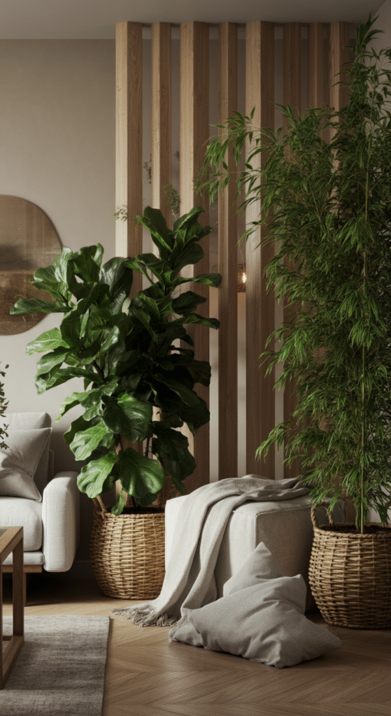 Plants play a central role in Scandinavian design, often bringing nature indoors to create a sense of tranquility. Using large indoor planters as room dividers adds both greenery and structure to your living room. Tall plants such as fiddle-leaf figs or bamboo can create a natural partition that doesn’t compromise the light or feel of the room.