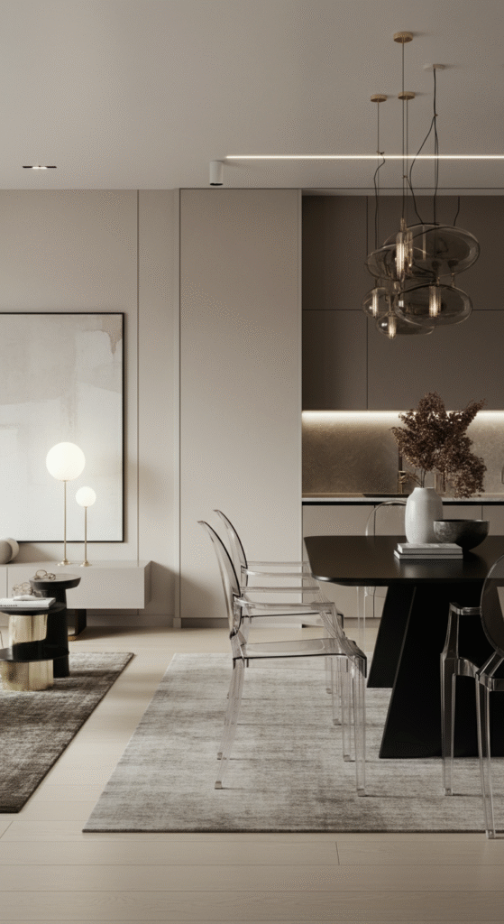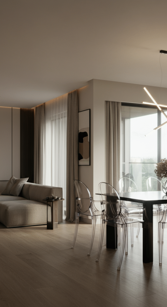 To keep your space feeling open, opt for glass or acrylic furniture. Glass dining tables, transparent chairs, or a sleek glass coffee table can create a feeling of lightness while maintaining a sophisticated look.