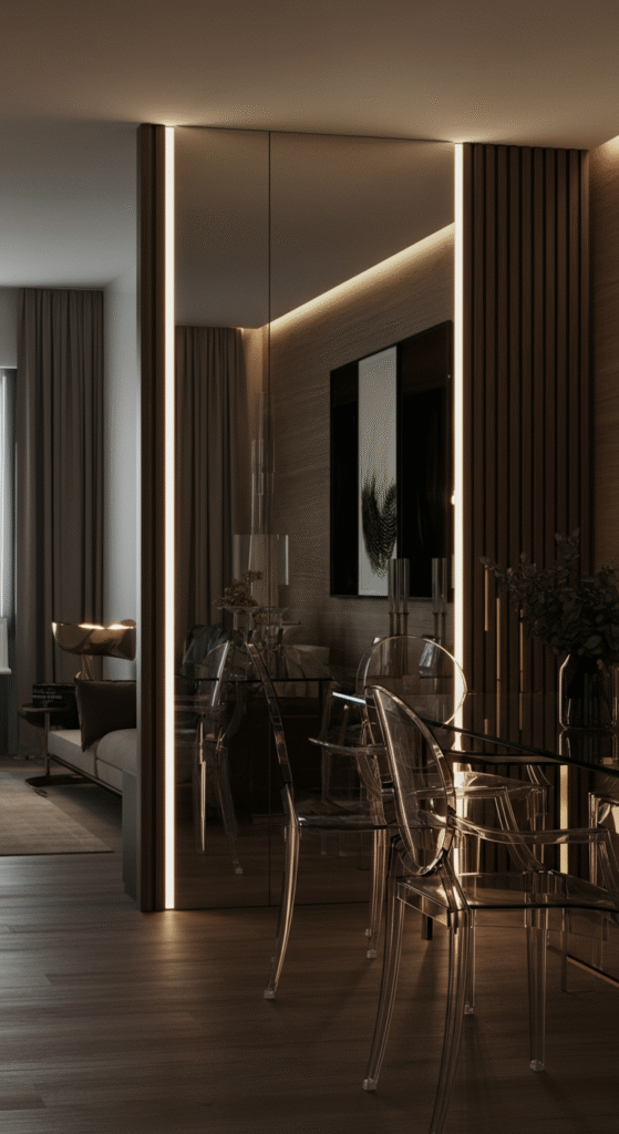 Mirrors are a great way to create the illusion of more space. By placing a large mirror on one wall or using mirrored furniture, you reflect light and make the room feel brighter and bigger.