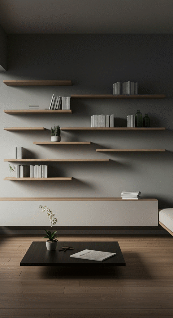 For instance, floating shelves can hold decorative items and essentials without taking up floor space. Additionally, a floating dining table mounted to the wall frees up floor space and gives a modern, industrial feel to the room.