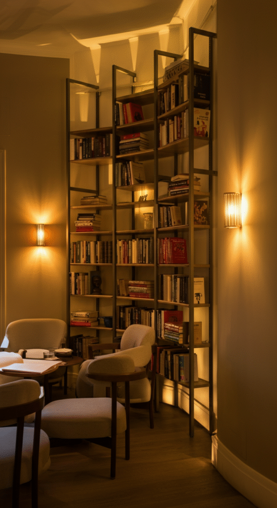Tall, slim bookshelves or wall-mounted lighting fixtures can also create the illusion of more room without crowding the floor area.