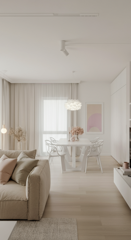 Color plays a major role in how spacious a room feels. When combining a living room and dining room, choose muted tones for walls, furniture, and accessories. Light shades of white, grey, or soft pastels make a room feel larger and more connected.