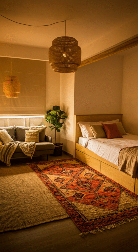 Use distinct yet harmonious rugs to separate your sleeping and lounging zones. For instance, a soft neutral jute rug can anchor your bed area, while a patterned kilim or Moroccan rug can create energy in your living section.