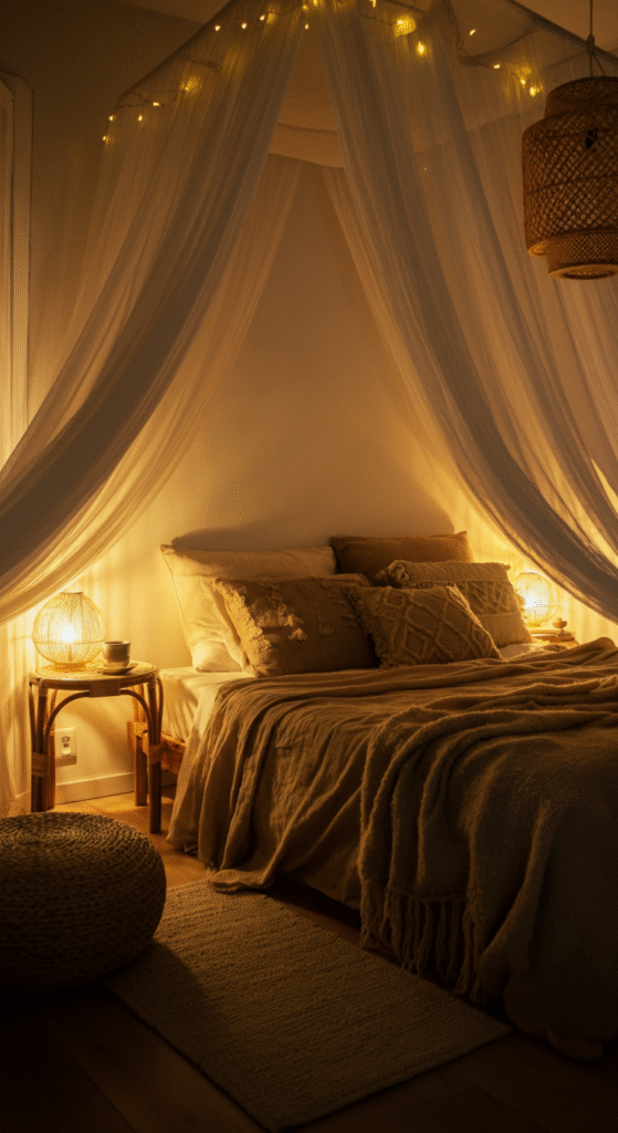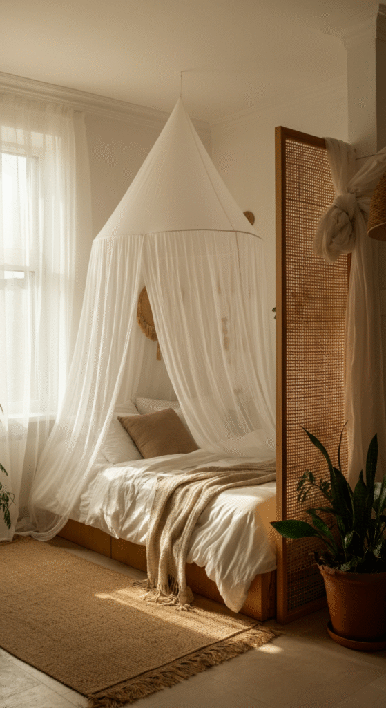 Consider using a bamboo screen, macramé curtain, or rattan room divider to subtly section off your sleeping space. A canopy made from airy linen or sheer cotton fabric adds softness while maintaining the open feel.