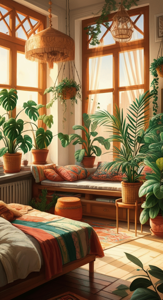 The essence of boho lies in texture. Combine rattan chairs, linen throws, jute baskets, and cotton bedding to evoke a grounded, organic atmosphere.