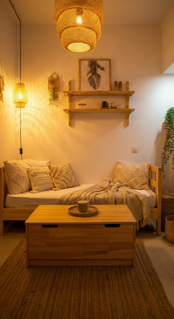 Interesting fact: Studies show that natural textures like wood and jute reduce stress and promote relaxation — exactly what you need when your living room and bedroom coexist in one.