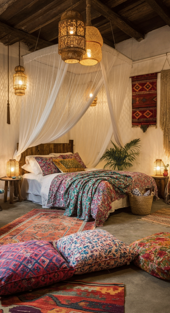 A boho layout thrives on freedom, but privacy still matters — especially if your bed sits near your seating area.