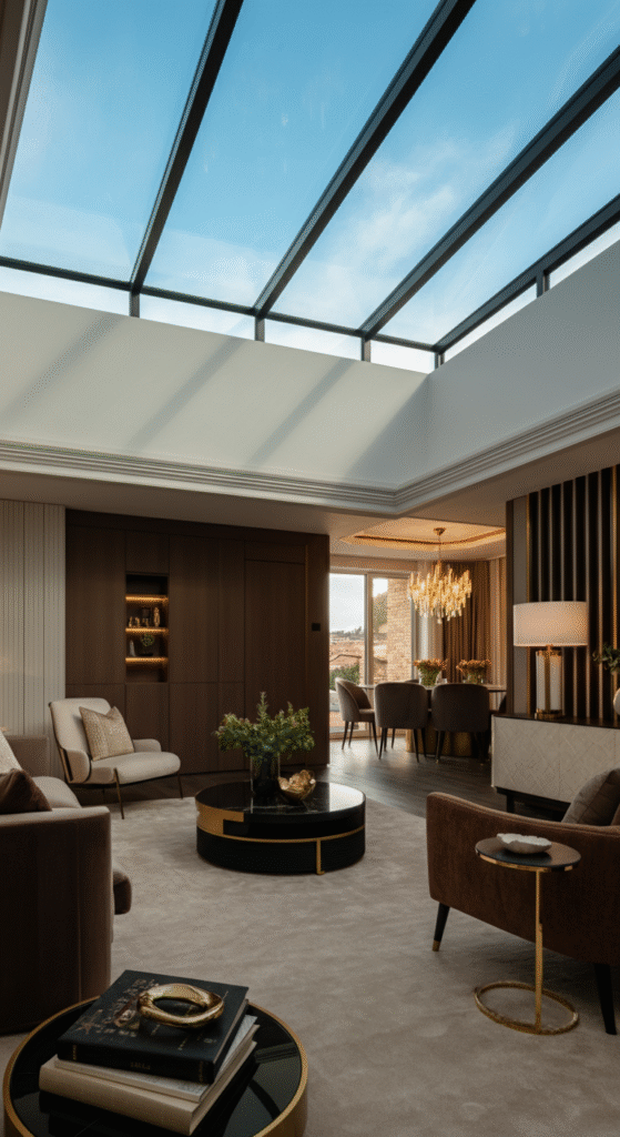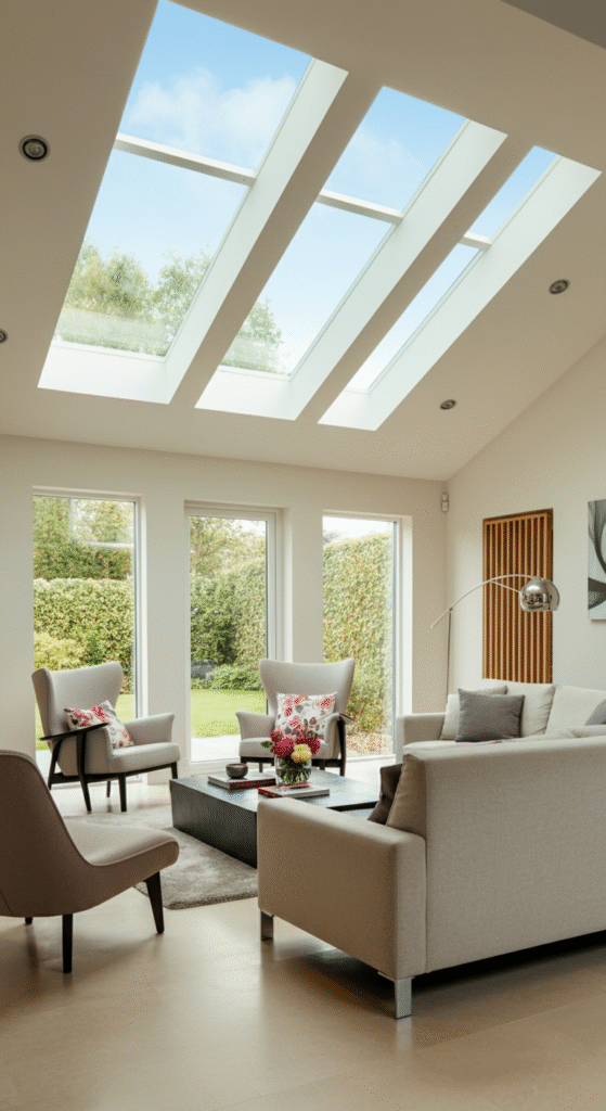 Adding a skylight to your ceiling is a great way to bring natural light into your living room, making the space feel larger and more inviting.