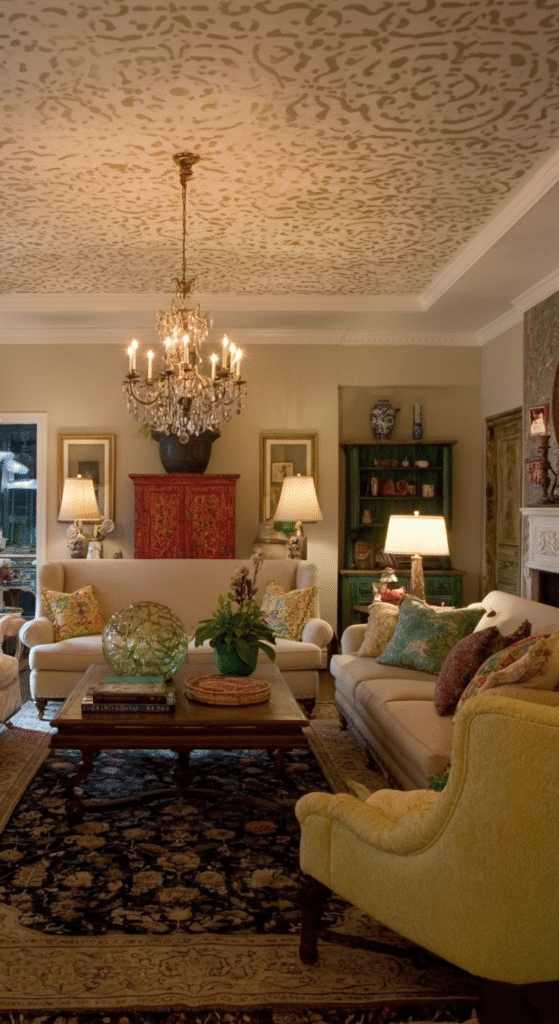If you’re looking to add a creative, artistic element to your living room, stenciled ceilings are a great option.