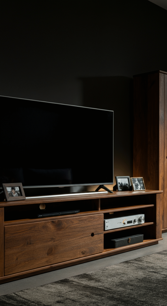 A media console with clean lines and a warm wood finish can help balance out more modern elements in the room. It’s a classic choice that combines practicality with elegance.