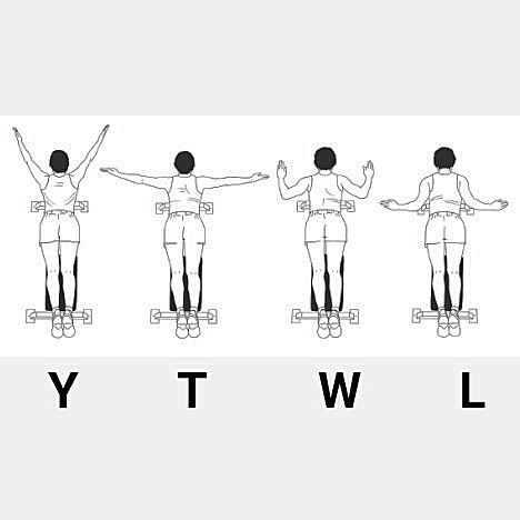 - Raise arms overhead in a “Y,” then move them to a “T” and finally a “W.”