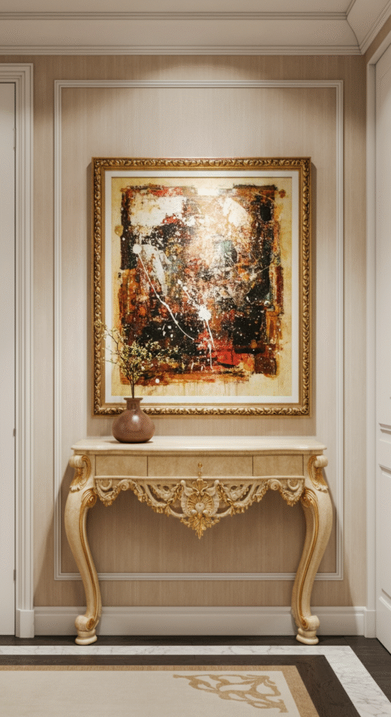 Hanging a striking piece of art above a console table or bench adds an artistic focal point to your entryway. Choose a piece that reflects your personal style, whether it’s a modern abstract painting, a vintage print, or a framed photograph.