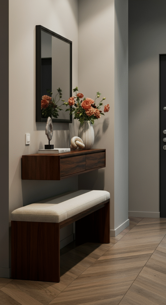 Including a functional yet stylish bench or console table in your entryway is both practical and decorative. A bench can act as a place to sit while taking off shoes, and a console table provides a spot for decorative objects like vases or lamps.