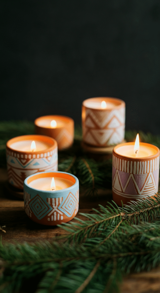 Turn simple terracotta pots into personalized candle holders. Paint them in soft pastels or tribal designs, then place soy candles or tealights inside.