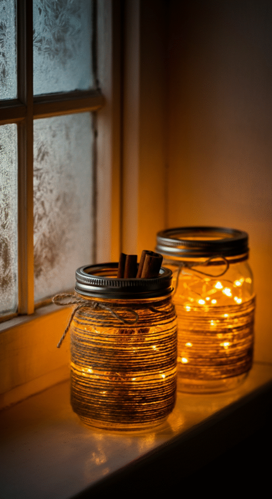 Reuse old mason jars to create soft glowing lanterns. Wrap jute twine around their necks and fill them with fairy lights.