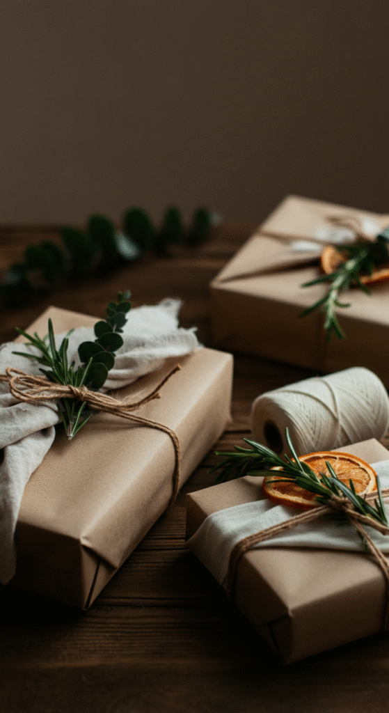 Instead of glossy wrapping paper, use kraft paper or cotton fabric wraps. Decorate with sprigs of rosemary, eucalyptus, or dried orange slices tied with twine.
