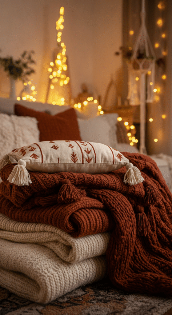 A true Boho Christmas is as much about comfort as it is about décor. Layer your couch with chunky knit throws, tassel blankets, and embroidered cushions in warm hues like terracotta, mustard, and ivory.