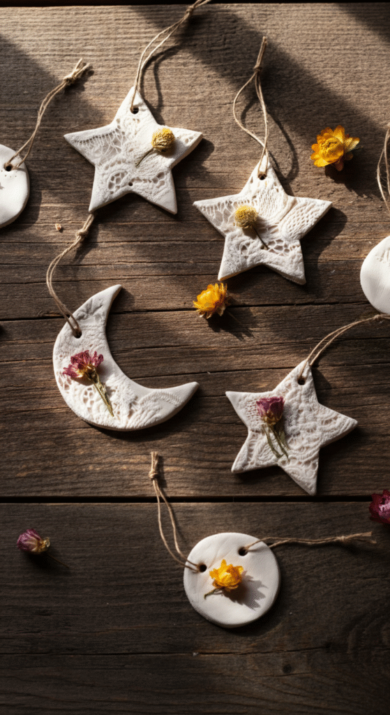 Make your own air-dry clay ornaments using cookie cutters in star, moon, and leaf shapes. Once dry, stamp them with lace or press dried flowers to imprint natural textures.