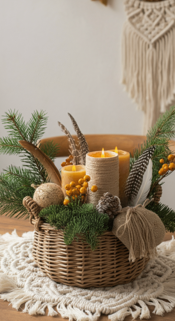 You can even add small pinecones, feathers, and dried berries for that Boho forest charm. This centerpiece not only looks natural but instantly grounds your holiday table in earthy elegance.