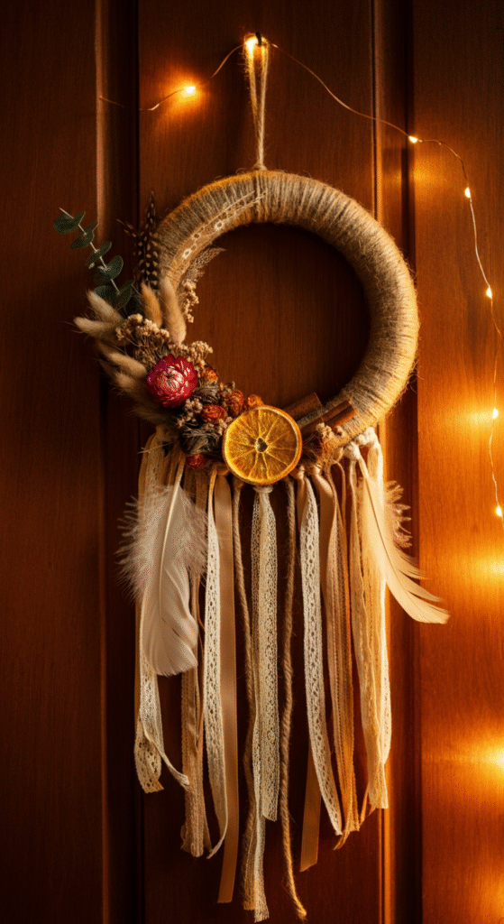 Instead of a typical round wreath, make a dreamcatcher-style Christmas wreath. Use a metal hoop wrapped in yarn or twine, add feathers, lace ribbons, and mini ornaments hanging below.