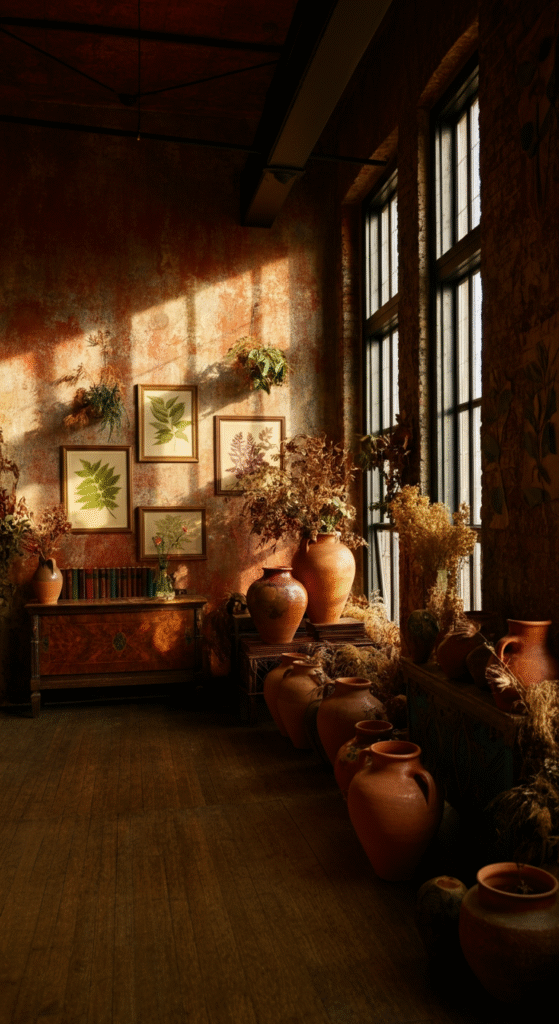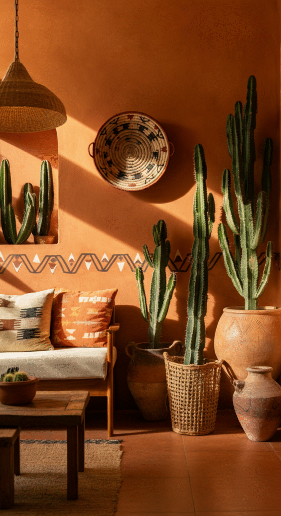 Bring the warmth of the desert indoors with terracotta walls, cacti, and sunbaked textures.