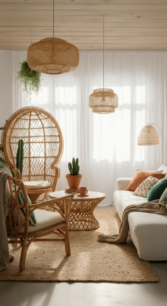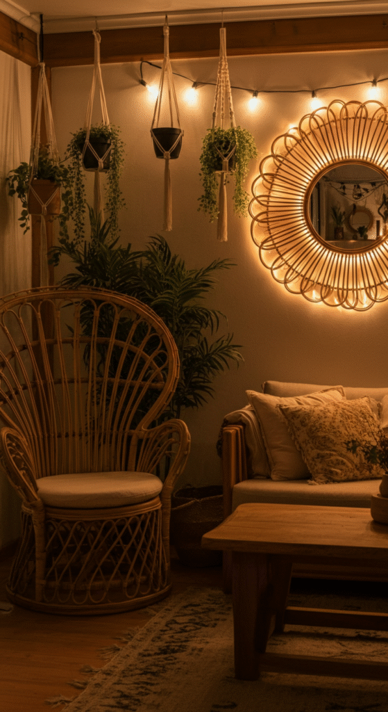 Rattan furniture is the heart of Boho design. Picture a wicker armchair, round rattan mirrors, and textured wall hangings.