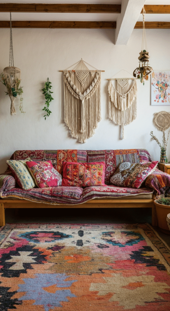 The eclectic Boho living room Zepeto setup brings in a mix of global-inspired prints, colorful cushions, layered rugs, and handmade wall art. It’s organized chaos that feels lived-in and full of stories.