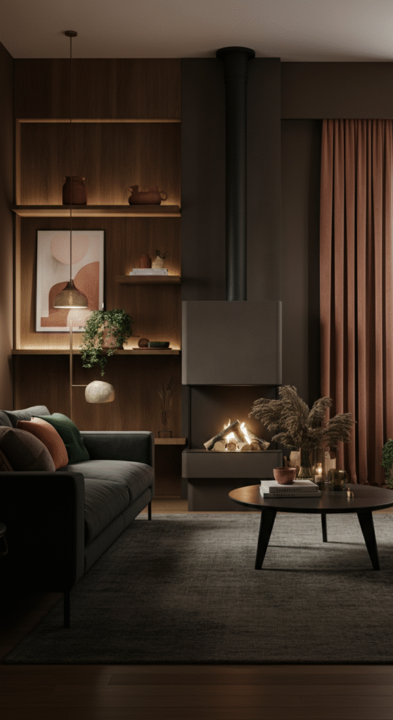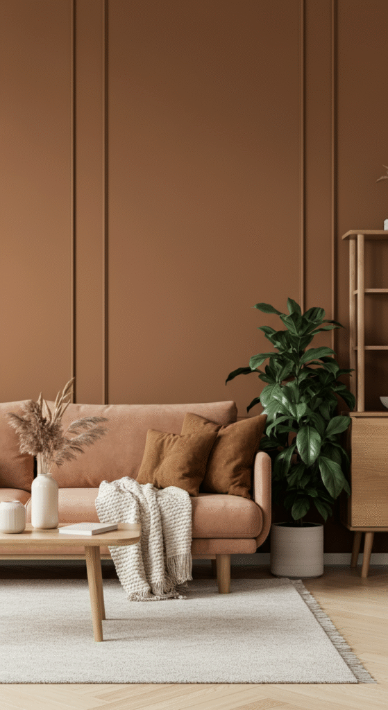 You can incorporate terracotta through accent pieces like throw pillows, vases, or rugs, or go bold with terracotta-colored walls or furniture. It’s a versatile color that pairs well with natural wood tones, greens, and neutrals, making it perfect for an earthy living room.