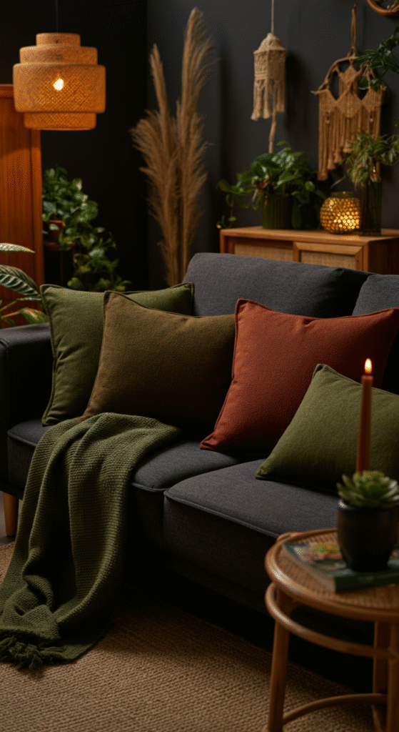 When it comes to soft furnishings, go for earthy, natural fabrics like linen or cotton for pillows and throws. Neutral tones with subtle patterns or solid earthy hues, such as ochre, deep green, and rust, can create a cozy and inviting atmosphere.