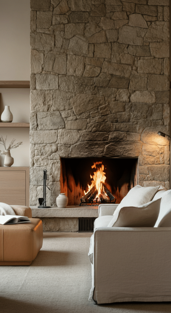 Stone accents, such as a stone fireplace or stone walls, bring an undeniable rustic charm to any living room. The natural texture of stone, with its unique patterns and earthy colors, can give the space an organic, timeless feel.