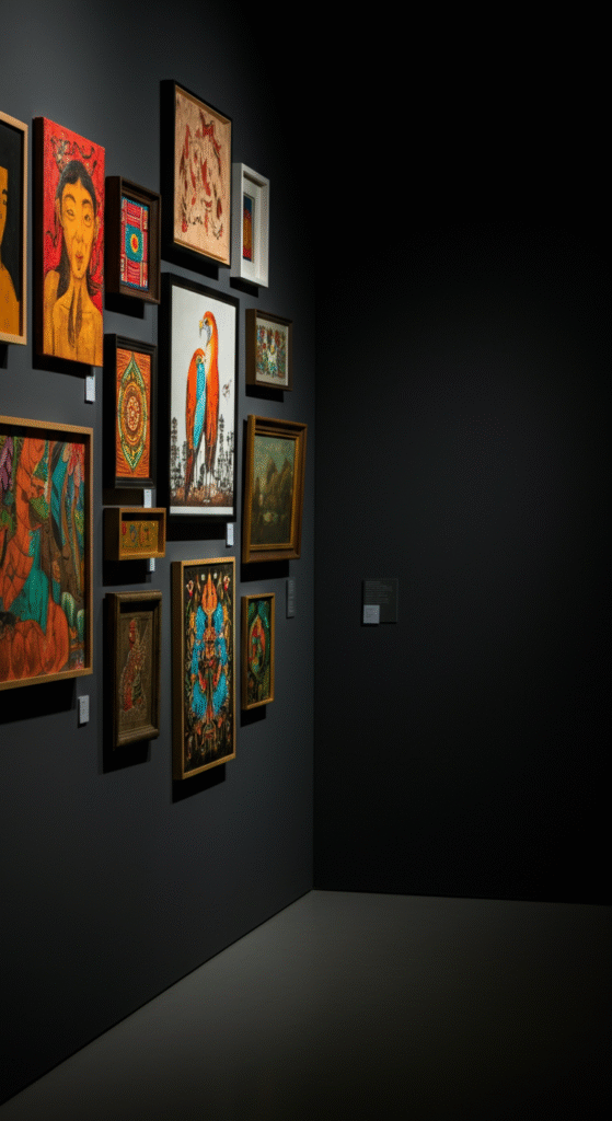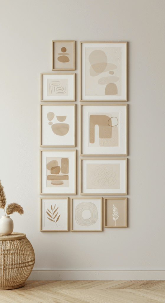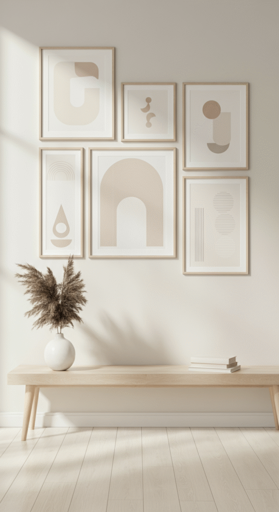 This layout works best with a few large, statement pieces placed at the center and smaller, evenly spaced works surrounding them. It offers structure while maintaining a sense of creativity and balance.