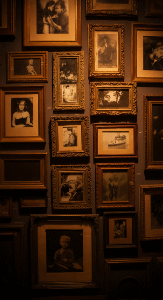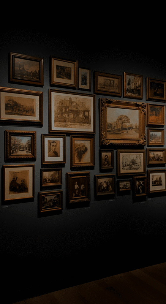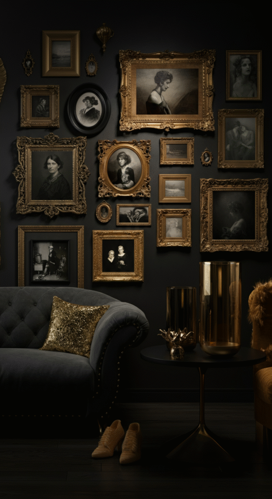 If you have a collection of vintage or heirloom pieces, why not create a gallery wall that evokes nostalgia and charm? The vintage layout involves pairing antique artwork, black-and-white photos, and classic frames to give your living room a timeless, warm atmosphere.