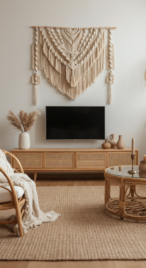 Start small — add macramé wall hangings, woven baskets, or plants. Even changing your TV console to rattan or wood can instantly add boho charm without a major expense.