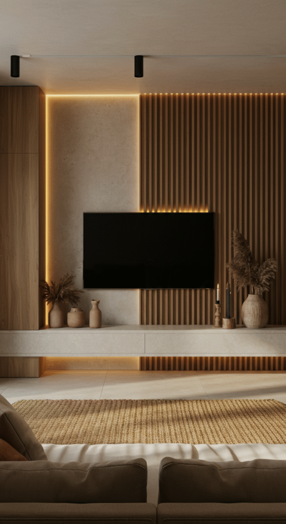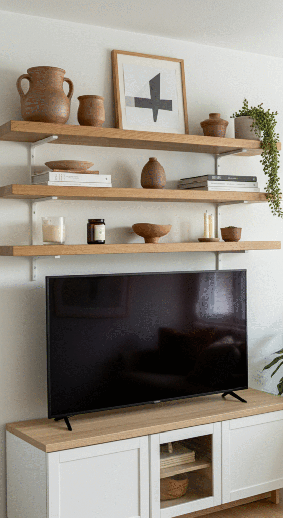 Add personality by styling your TV wall with open wooden shelves. Display ceramics, plants, candles, or vintage books — items that speak to your story.