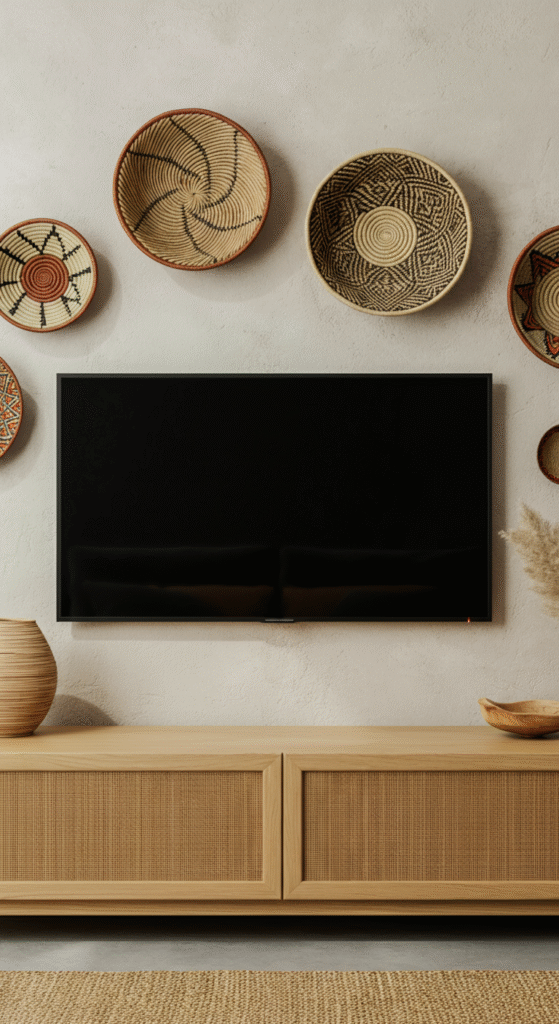 Transform your wall into a piece of African or tribal art by arranging woven baskets in circular clusters around the TV. The varying sizes and patterns create visual rhythm and texture.