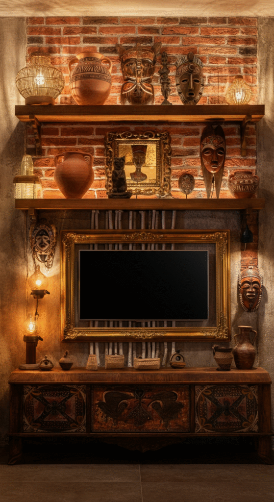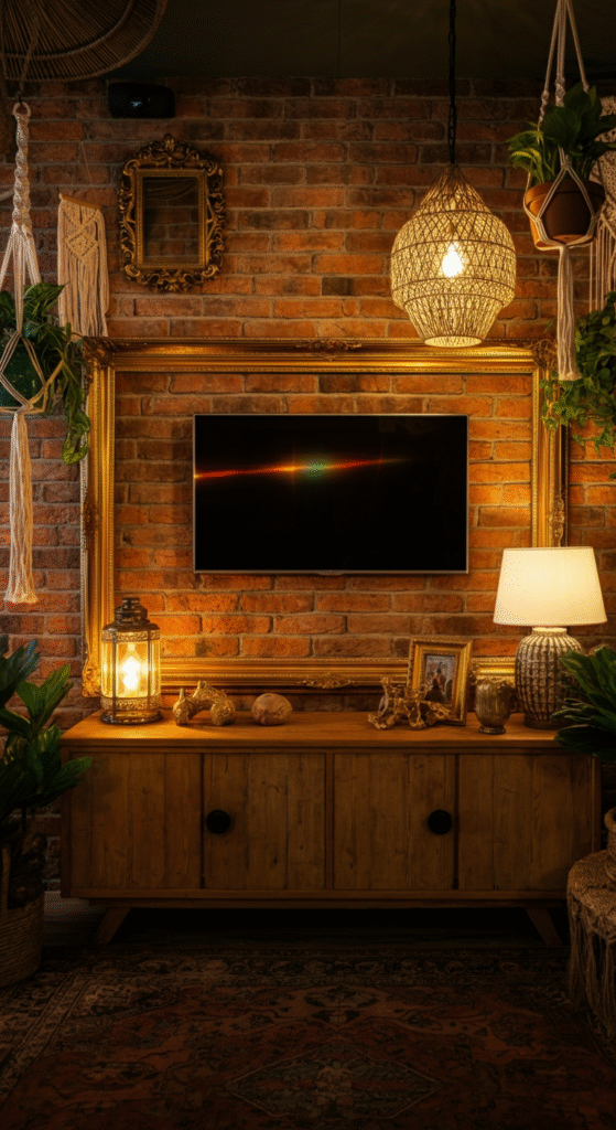 Exposed brick walls give your TV area an industrial backbone — perfect for contrasting boho softness. Add woven textures, plants, and a wooden console to balance raw brick with organic warmth.